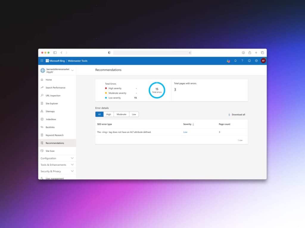É a consola da Microsoft que te permite indexar o teu website no Bing e acompanhar a sua performance no motor de busca – de forma muito semelhante à Google Search Console. Vais ser capaz de identificar quais as páginas que estão a atrair mais tráfego orgânico, para que keywords estás a aparecer, que domínios estão a gerar backlinks para o teu e muito mais.